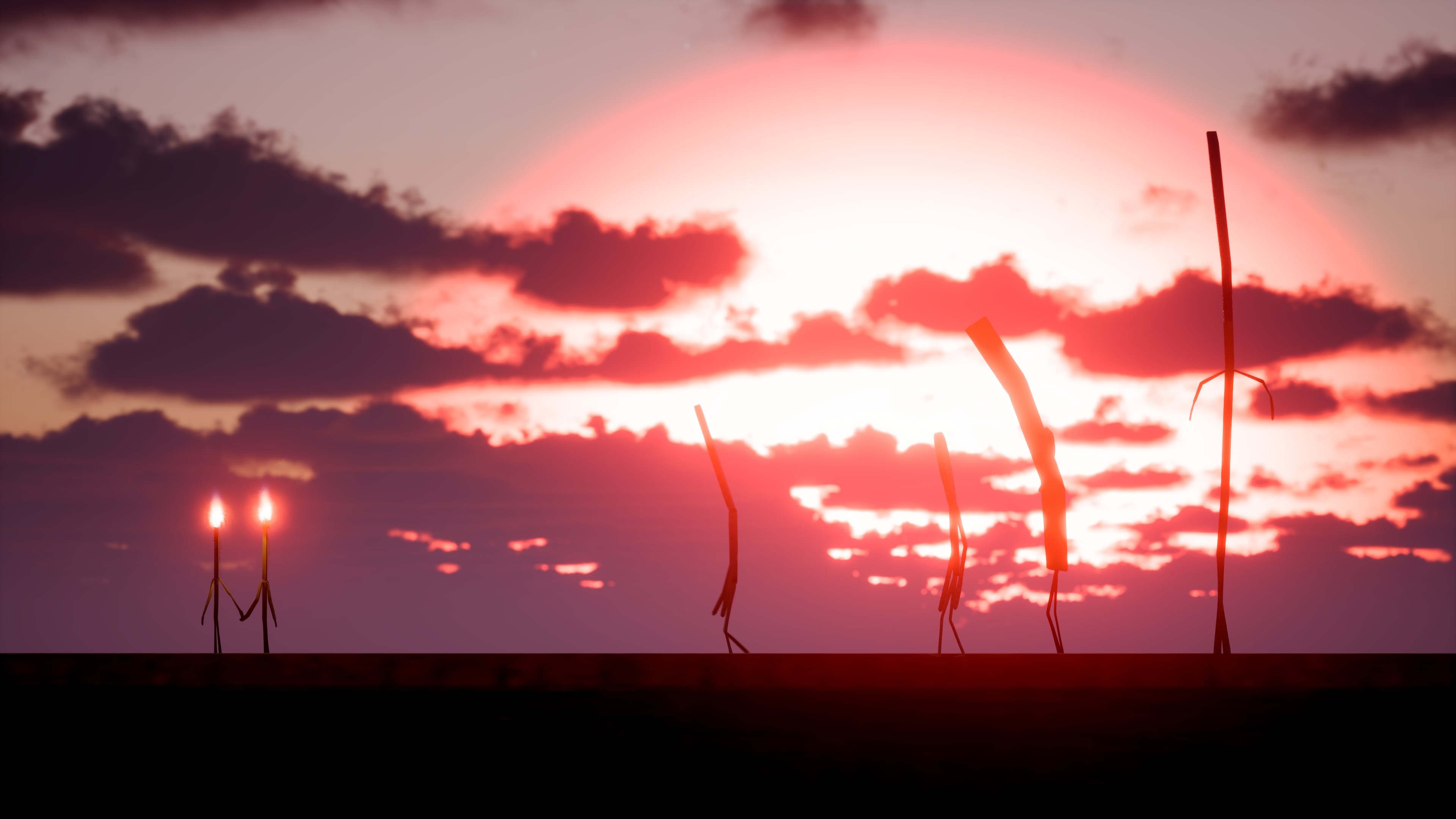 The animation was created in Unreal Engine with a mixture of motion capture and hand-animated scenes, with most motion capture needing some level of readjustment to suit the pose or angles I wanted. Having main characters with elongated limbs meant they didn’t move quite like regular humans, with tall heads needing their movement dialled back. For some scenes with highly specific movement, like him trying to light himself (to get warm) this had to hand animated as the movement was so important to get right. For the crowd scenes there's about 5000 match sticks as well as a mixture of other characters like chopsticks, lollipops and even the odd cinamon stick. There's a pritistick and a hockey stick but these didn't make the final version. This level of scale was achieved using a plugin called "Overcrowd" which uses Unreal Engine's niagra particle system to scatter assets across a scenes. It's possible to get that system to do more sofisticated things, but I just wanted happy waving sticks and didn't want to over complicate what was on of the more techical scenes. One of the other challenges was the rain. I used the Easy Rain plugin for the rain, which worked great especially in the opening scenes but could run into issues due to the small scale - with droplet levels sometimes being too spare or heavy until these were dialed for the scale. I'm really happy with how the rain works on the opening shot. To get a high qualtiy sunset I could have reached for HDRIs but used Ultra Dynamic sky as I needed the ablity to control time of day on the lead up to this.
